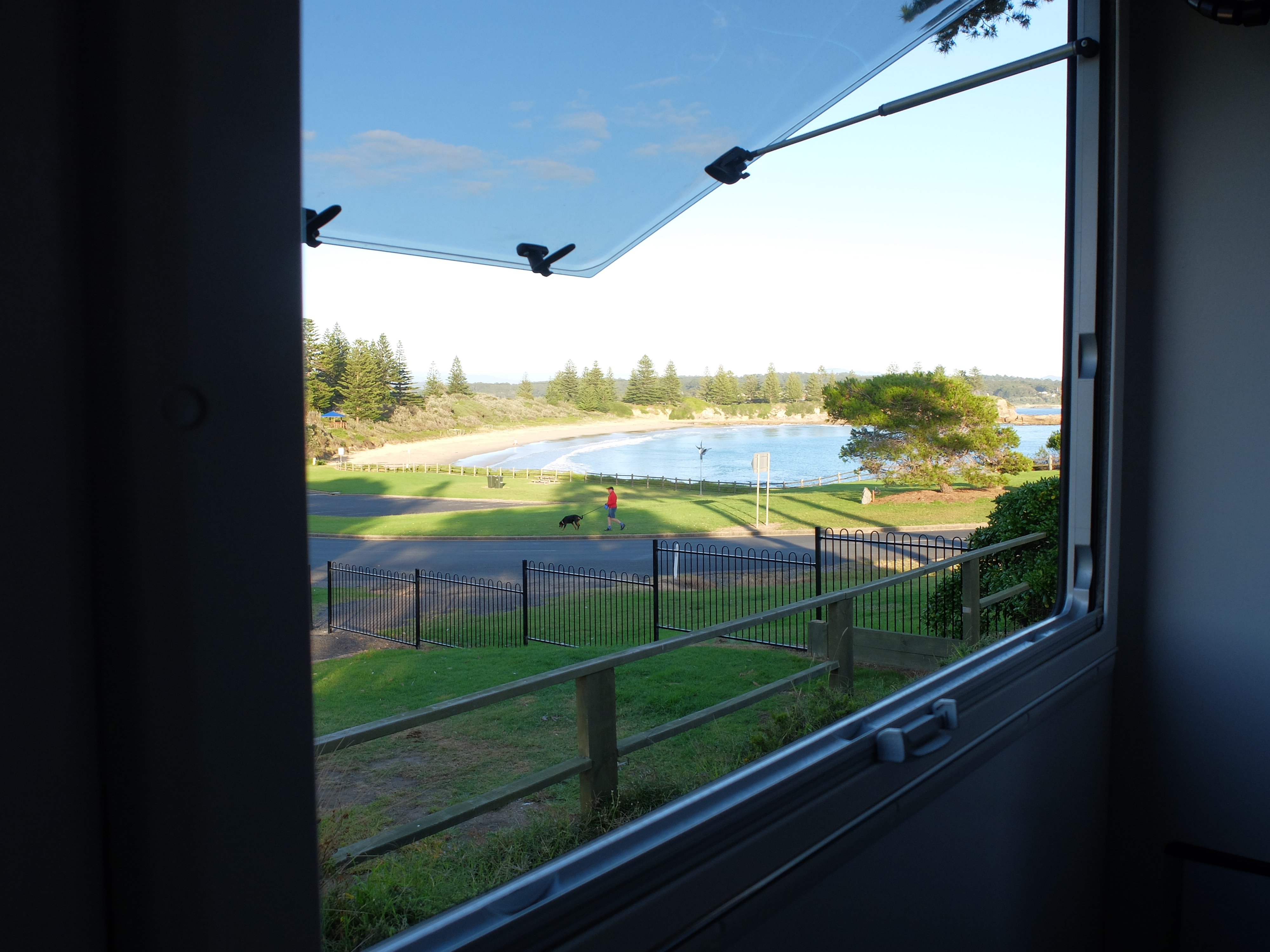 The last post promised updates from Bermagui, which is a great little town and helped us in our ever growing assessment of what a good camp site should entail.. Although we are yet to go too far off the beaten track and as yet have not free camped (unless you count a complimentary night as part of that “out of season resort town” hospitality) the view from our campsite in Bermagui was so good it set a new standard for what the ultimate campsite would have. Other plusses were that it was close to the township, had great beaches and excellent seafood!