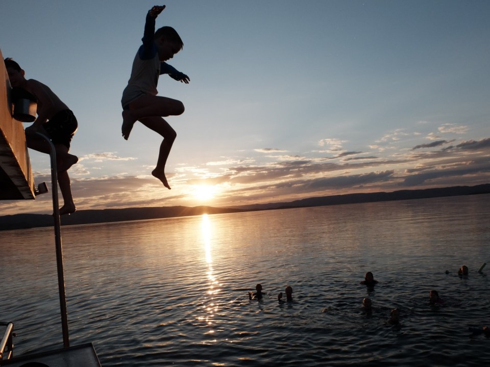 Denver jumping off the roof of the boat as the sun sets behind him!
