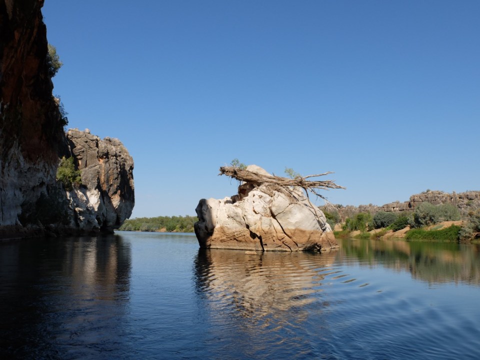 DSCF5541 ← Previous Next → All along the river you can see the impact of the wet season, in this case it deposited this tree on top of the rock island!